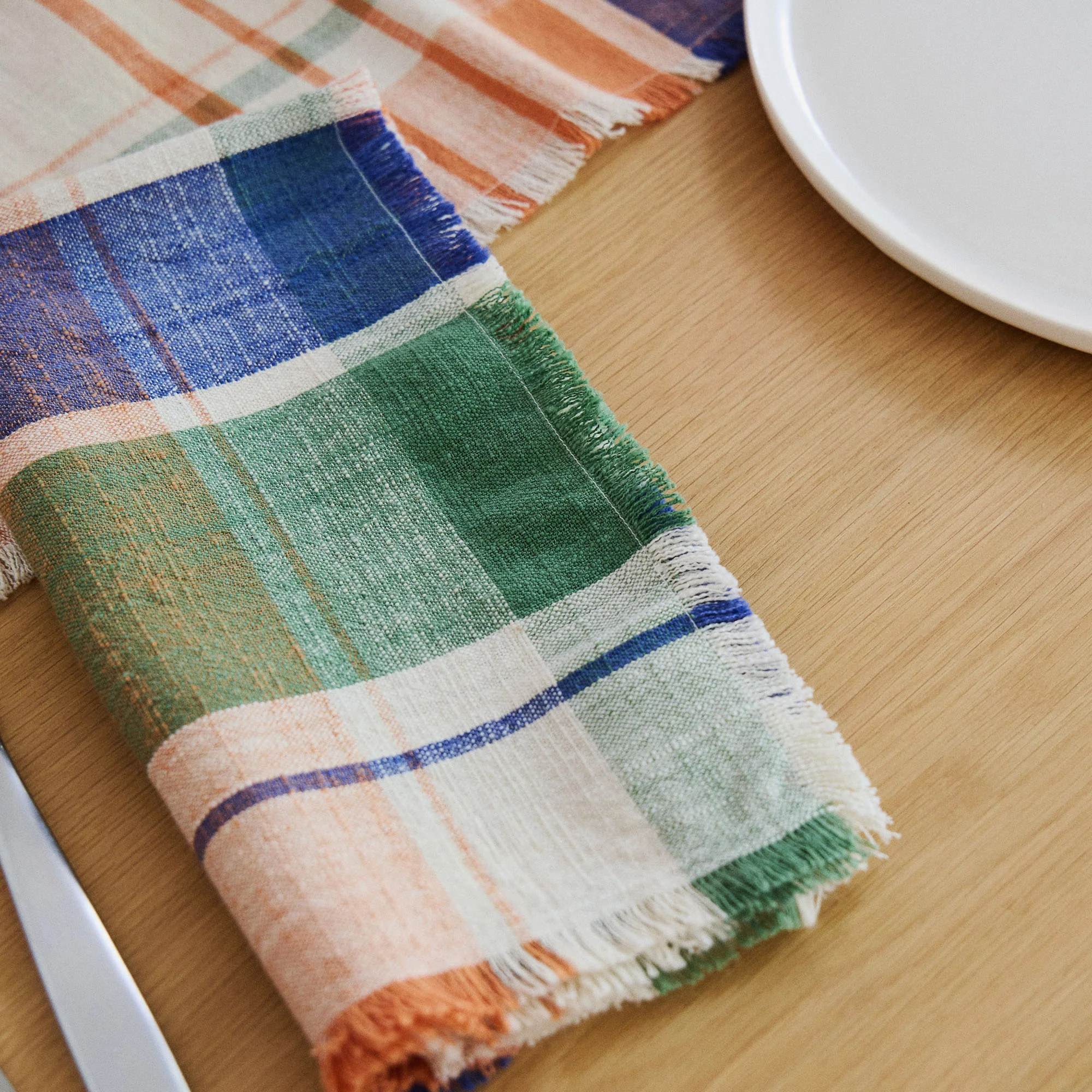 Made in India from yarn-dyed 100% lightweight cotton, the Marabar napkins are available as sets of two in five vibrant check patterns with delicate fringing detail.Â