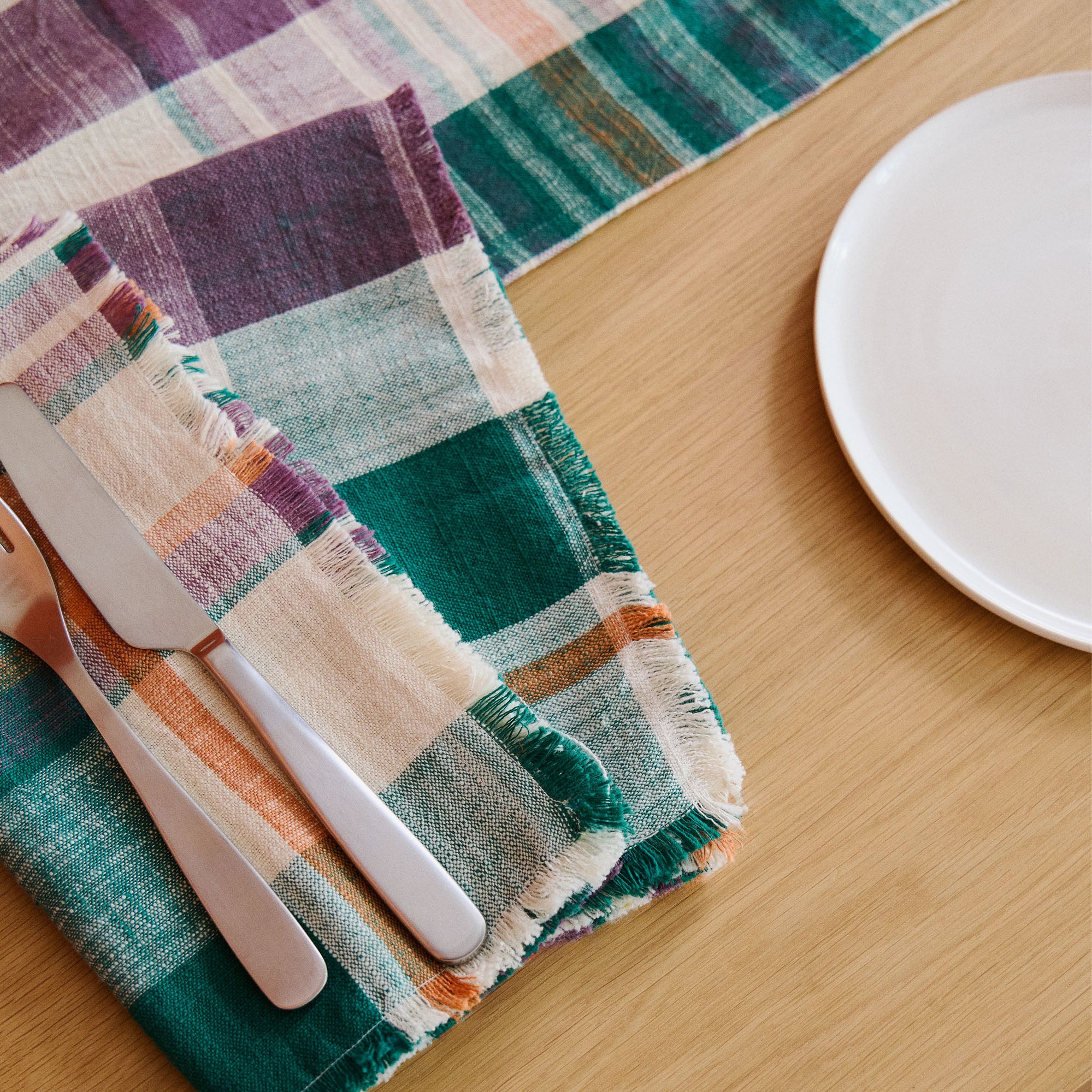 Made in India from yarn-dyed 100% lightweight cotton, the Marabar napkins are available as sets of two in five vibrant check patterns with delicate fringing detail.Â
