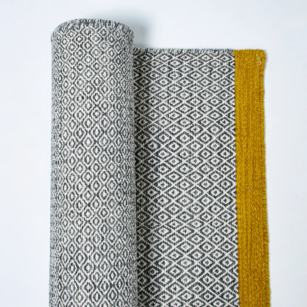 The Mini Diamond Kilim in a charcoal and rich pollen finish was woven and dyed entirely by hand in India.