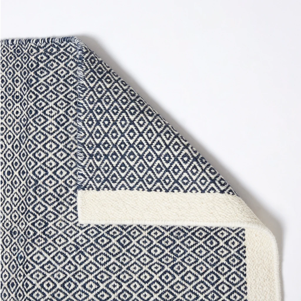 The Mini Diamond Kilim Rug in an indigo ink hue has been woven and dyed entirely by hand in India and would make a contemporary and comfortable addition to your interior.